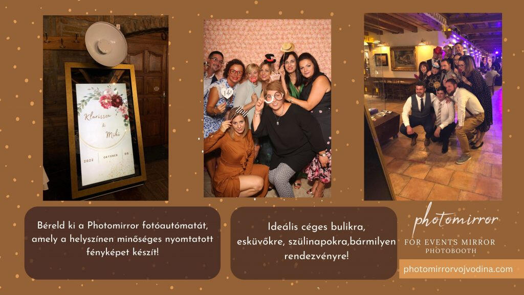 A szórakoztató fotózás koronázatlan királya!Dobd fel te is a rendezvényedet egy fotóssarokkal, ahol megörökítésre kerül az ünnepi hangulat. A Photomirror egy elegáns fotótükör, ami minőségi képeket készít rólad és a vendégeidről.Hogyan is működik?Ha készen álltok a fotózásra, az érintőképernyőn elindíthatjátok a fotózást és mehetnek a pózok! A tükör mögött egy professzionális fényképezőgép teszi a dolgát, majd miután elkészültek a képek, kinyomtathatjátok azonnal a helyszínen! A fotón szerepelni fog egy QR kód amivel pedig letölthetitek az elektromos képeket közvetlen a phototmirror munkaideje után.A nyomtatás minőségét egy felsőkategóriás fotónyomtató garantálja.Esküvő, céges parti, szülinap, fesztivál – legyen szó bármilyen rendezvényről, a photomirror egy tökéletes választás neked és a vendégeidnek, ahol a mosolyok örökre az arcokon maradnak.